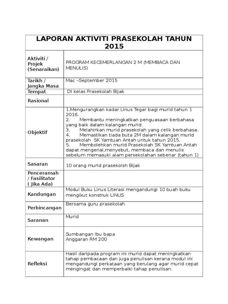 Contoh Laporan Aktiviti Prasekolah Doc