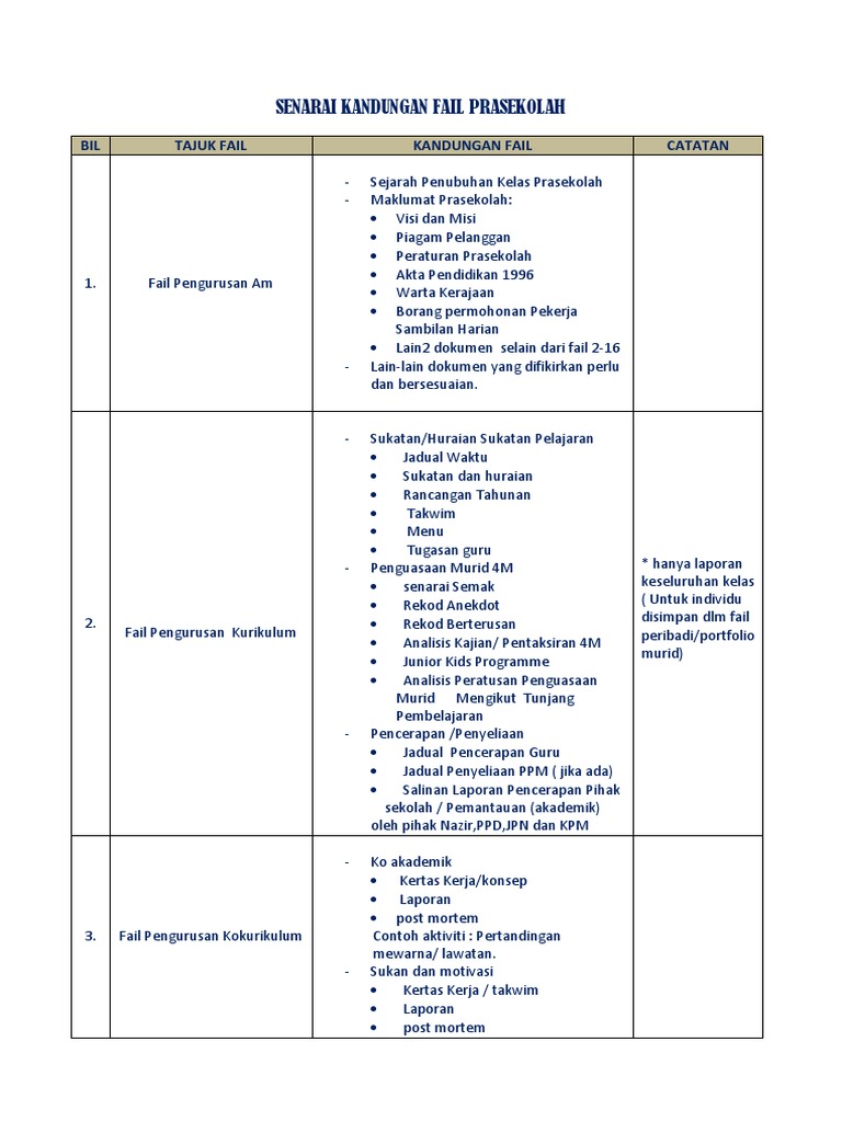 Senarai Kandungan Fail Prasekolah 2013
