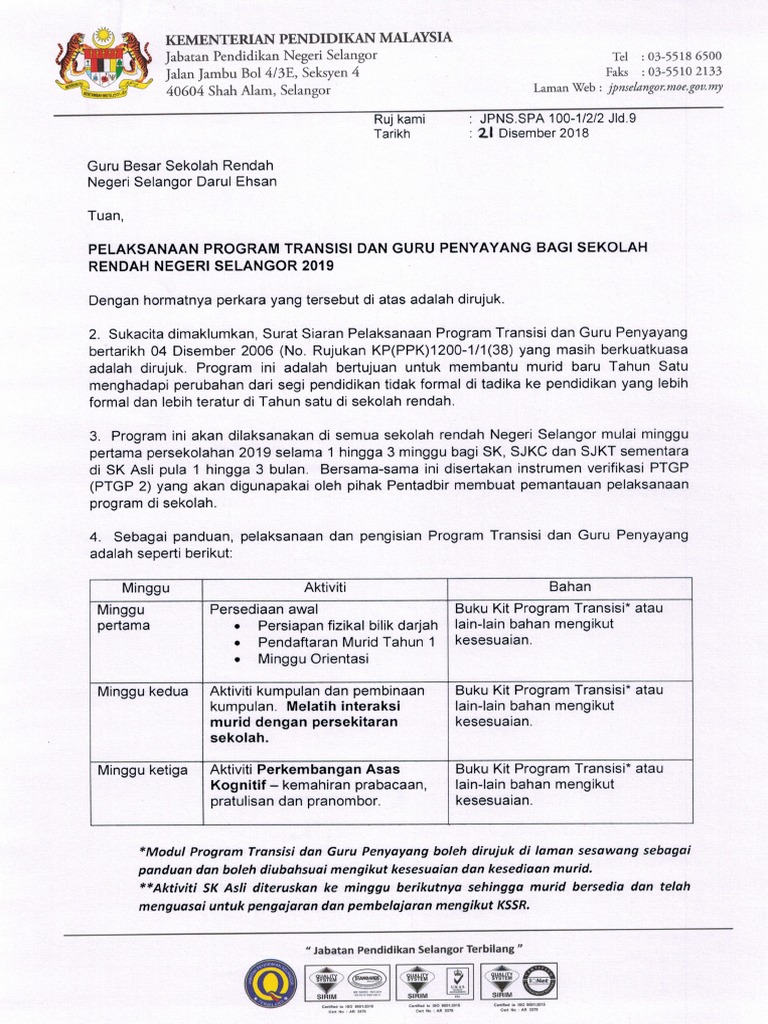 Pekeliling Minggu Transisi Dan Guru Penyayang