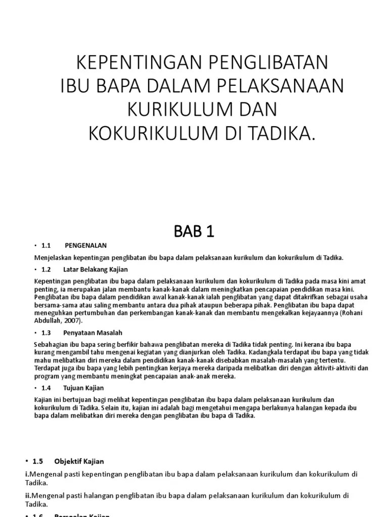 Pihak tadika juga perlu sentiasa positif dan. Menemuduga ibu bapa berkaitan dengan penglibatan anak-anak dalam segala aktiviti ibu bapa dan pihak sekolah bekerjasama menjalankan sesuatu projek untuk kanak-kanak mengambil kira faktor sejarah kanak-kanak. Penglibatan Bilangan Perot us Yo 287 306 Tidak 651 693.