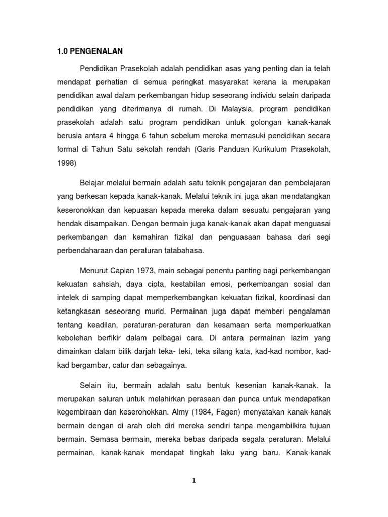Ia boleh dikategorikan sebagai. Bagi meraikan bulan yang bermakna ini jom ikuti 6 aktiviti menarik yang boleh dilakukan untuk meningkatkan keterujaan dan semangat patriotik di kalangan kanak-kanak. 44 KESIMPULAN Pendidikan prasekolah bertujuan untuk memperkembangkan potensi kanak-kanak yang berumur empat hingga enam tahun secara menyeluruh dan bersepadu dalam aspek jasmani emosi rohani intelek dan sosial melalui persekitaran pembelajaran yang selamat menyuburkan serta aktiviti yang menyeronokkan kreatif dan keyakinan dan membentuk.