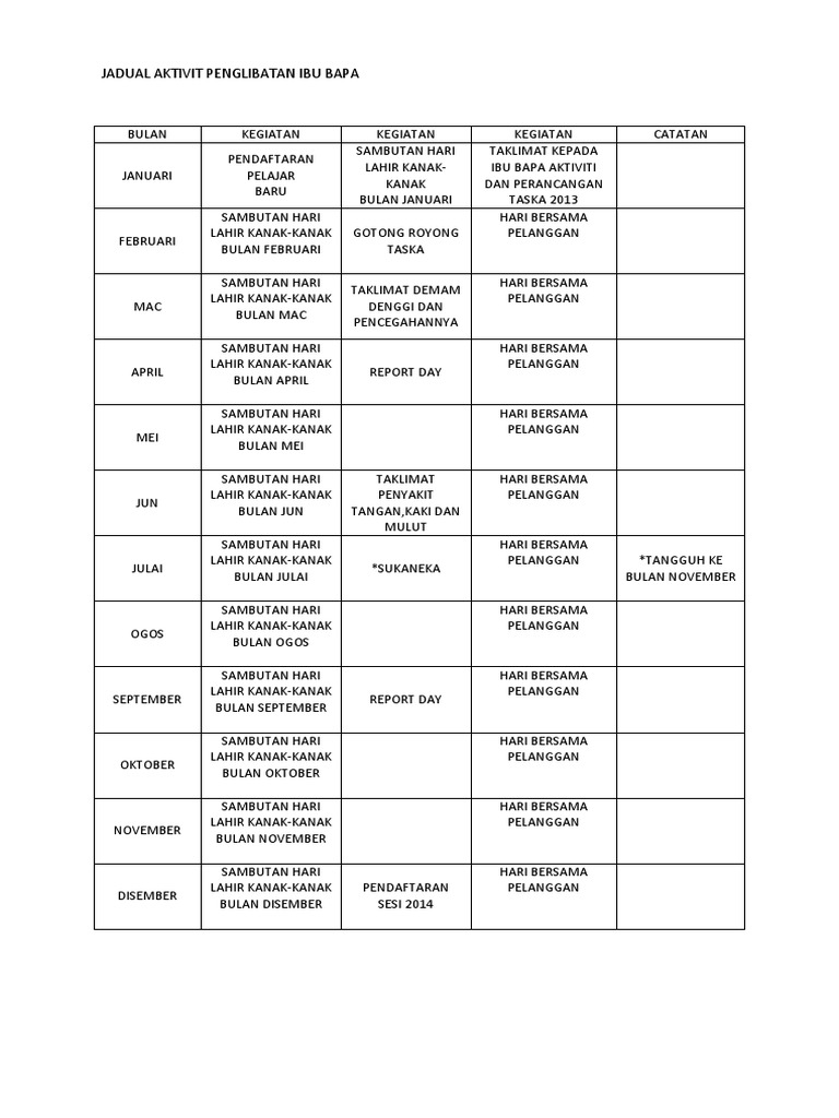 Jadual Aktivit Penglibatan Ibu Bapa