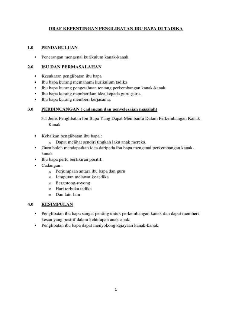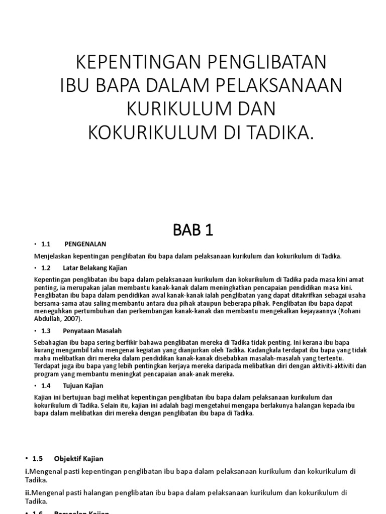 Skop kajian ini hanya melihat kepada empat faktor sahaja iaitu faktor kepimpinan PIBG kefahaman ibu bapa tentang peranan mereka dalam PIBG faktor kesibukan tugas seharian dan faktor sikap ibu bapa. Penglibatan dapat ditakrifkan sebagai usaha bersama-sama atau saling bantu-membantu antara dua pihak ataupun beberapa pihak. Rutin dan Peraturan di Tadika Bab 14 Isu dan Cabaran Isu Penglibatan Ibu Bapa Isu Kerap Bertukar Guru Isu Premis Isu Mementingkan Kehendak Ibu Bapa Lampiran Lampiran 1Akta Pendidikan 1996 Lampiran 2Peraturan-peraturan Pendidikan Kurikulum Prasekolah Kebangsaan Lampiran 3Contoh Kertas Kerja Menubuhkan Tadika Lampiran 4Contoh Rekod.